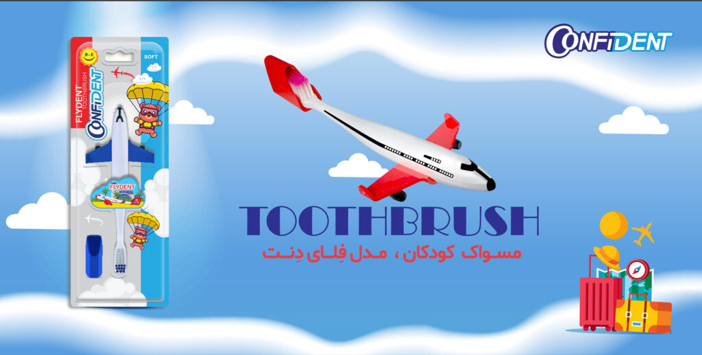 مسواک کودک کانفیدنت مدل فلایدنت طرح هواپیما Flydent در بسته بندی بلیسترپک تمیز کننده موثر دندان ها با برس های نرم (سافت) محصول شرکت تاج سلامت ایرانیان